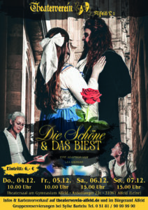Im Dezember bringen wir mit Die Schöne und das Biest das Kinderstück 2025 auf die Bühne des Theatersaals am Gymnasium Alfeld. Gespielt wird eine Adaption unserer Regieassistentin Lea Stephan.